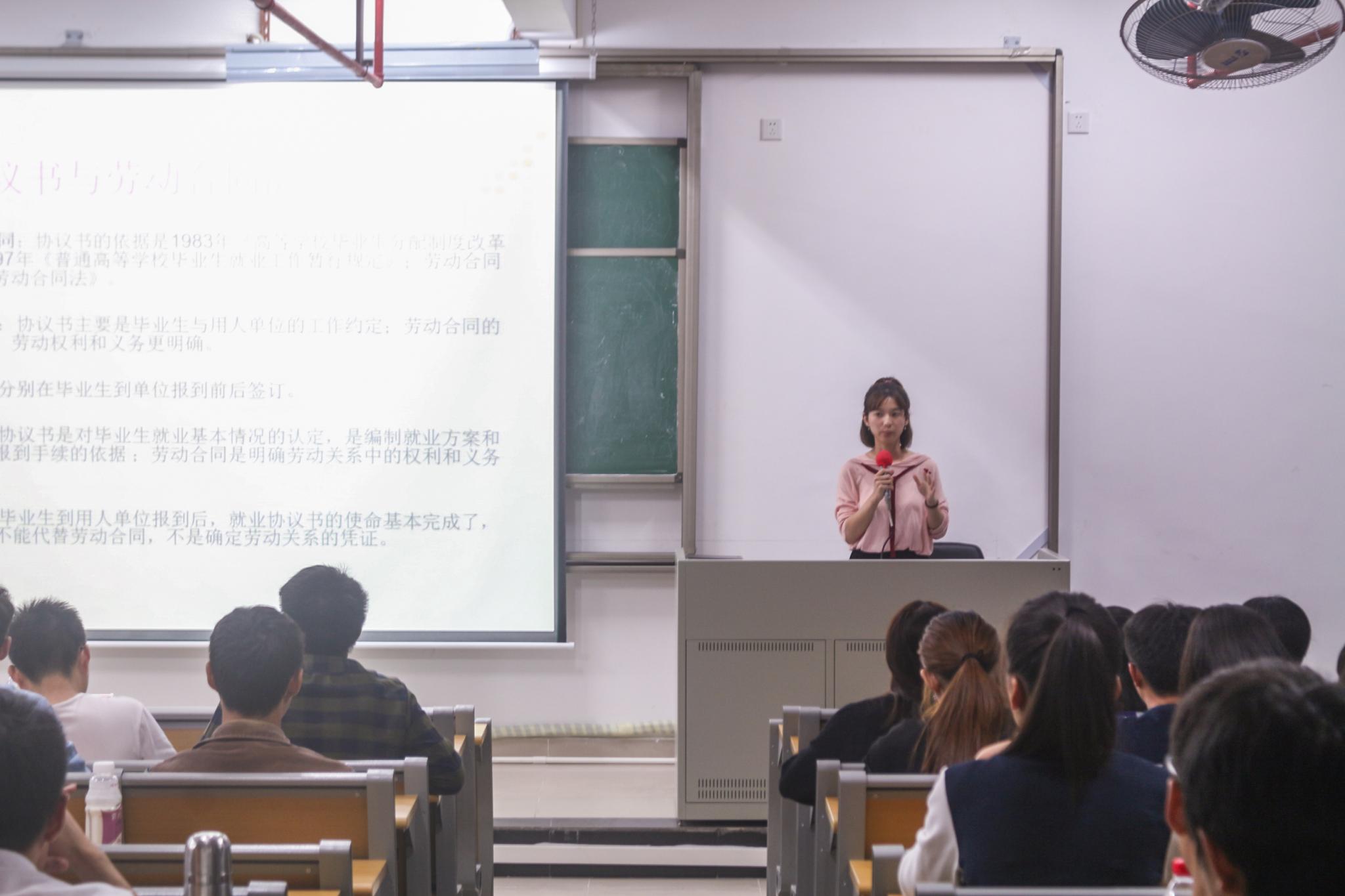 大会伊始,辅导员张雯涵上台为大家讲解毕业生的就业流程及相关手续的办理,主要内容有四方面:第一,关于三方协议;第二,关于报到证;第三,关于就业方案;第四,关于毕业生档案。