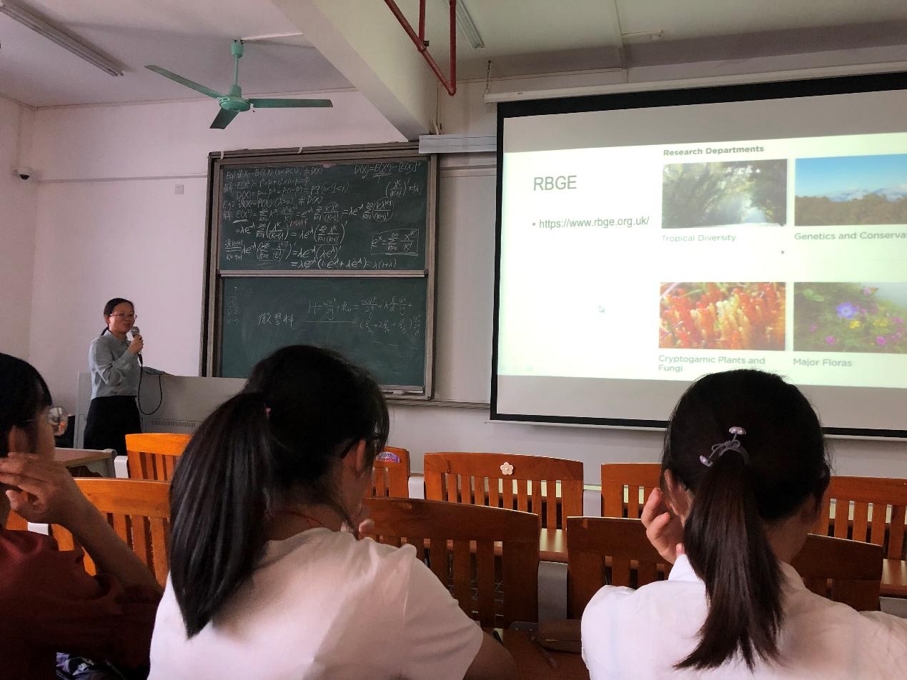 讲座伊始,胡秀老师对于大多数学生关心的问题——怎样才可以出去访学,进行了详细的说明和介绍。接着胡秀老师讲解自己去英国爱丁堡植物园的访学历程,以图片的方式详细地介绍了自己在爱丁堡对姜花属分类学的研究和在英国的生活状态。随后,胡秀老师讲述了在爱丁堡植物院做的植物引种驯化及活体保存相关课程的教学观摩,讲述的过程中,胡秀老师也会谈到自己在英国的所见所闻,英国植物文化,和英国人对植物的热爱等等。最后,胡秀老师介绍了在英国参加的一些和研究课题有关的活动,对同学们的提问也一一作出了回答。胡秀老师详细而又专业的讲述,深深吸引了同学们,加深了同学们对植物的专业认识以及学习兴趣。