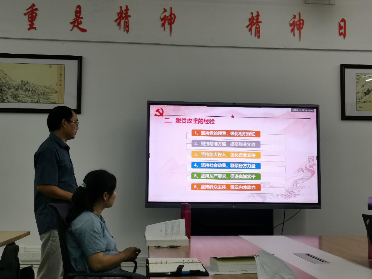 教工第一党支部书记吴智明结合自己学习《习近平谈治国理政》第三卷中“决胜全面建成小康社会,决战脱贫攻坚”主题,结合自己去暑假随专家团赴贵州毕节开展蔬菜产业扶贫的经历,和自己参与教育扶贫的经历,讲微党课。吴智明分享了十八大以来,中国共产党在扶贫攻坚中取得的伟大成绩,以及我党总结的脱贫攻坚的经验,回顾了驻村第一书记黄文秀,河北农业大学李保国教授深入扶贫的的感人事迹,同时分享了自己随高中班主任老师参与教育扶贫的经历。