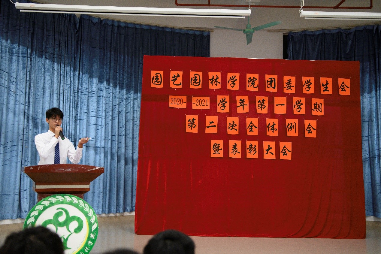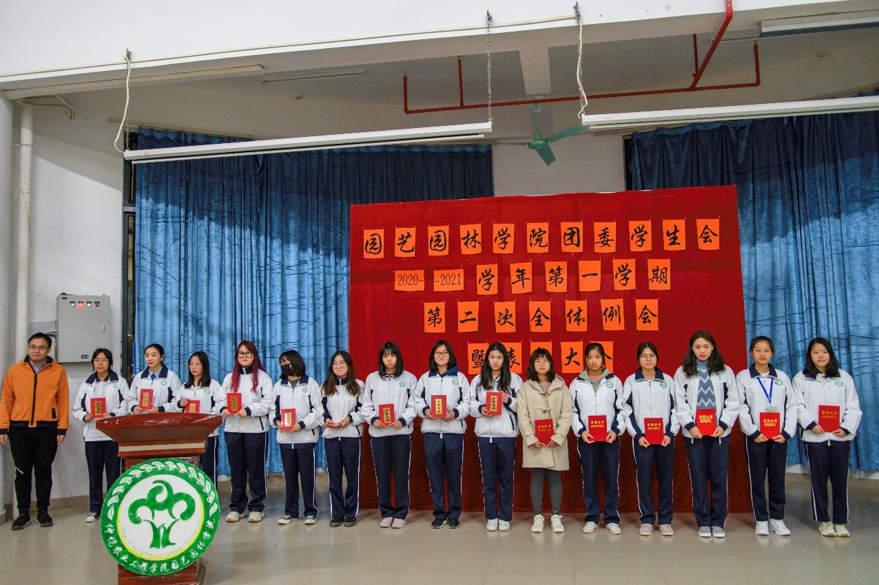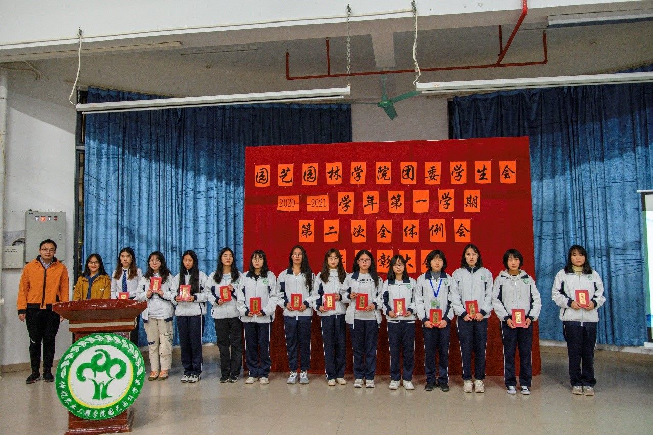 为表彰运动会获奖运动员、总结团委学生会一学期以来的工作情况,园艺园林学院于1月5日晚在白云校区D1小礼堂召开团委学生会2020年-2021学年第一学期第二次全体例会暨表彰大会。辅导员李剑峰、聂恺阳,团委第一副书记吴红霏,第二副书记罗泽彬、黄梓潆,学生会执行主席纪悦,青协执行会长周晓梦及校学生会代表和校团委代表出席本次会议,我院团委学生会全体干部以及校运会、院运会获奖同学参加本次会议。