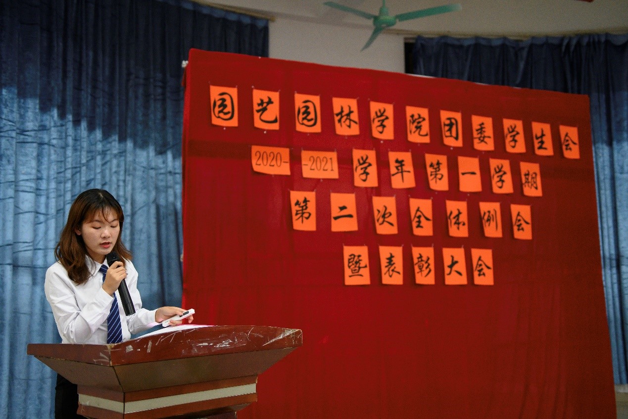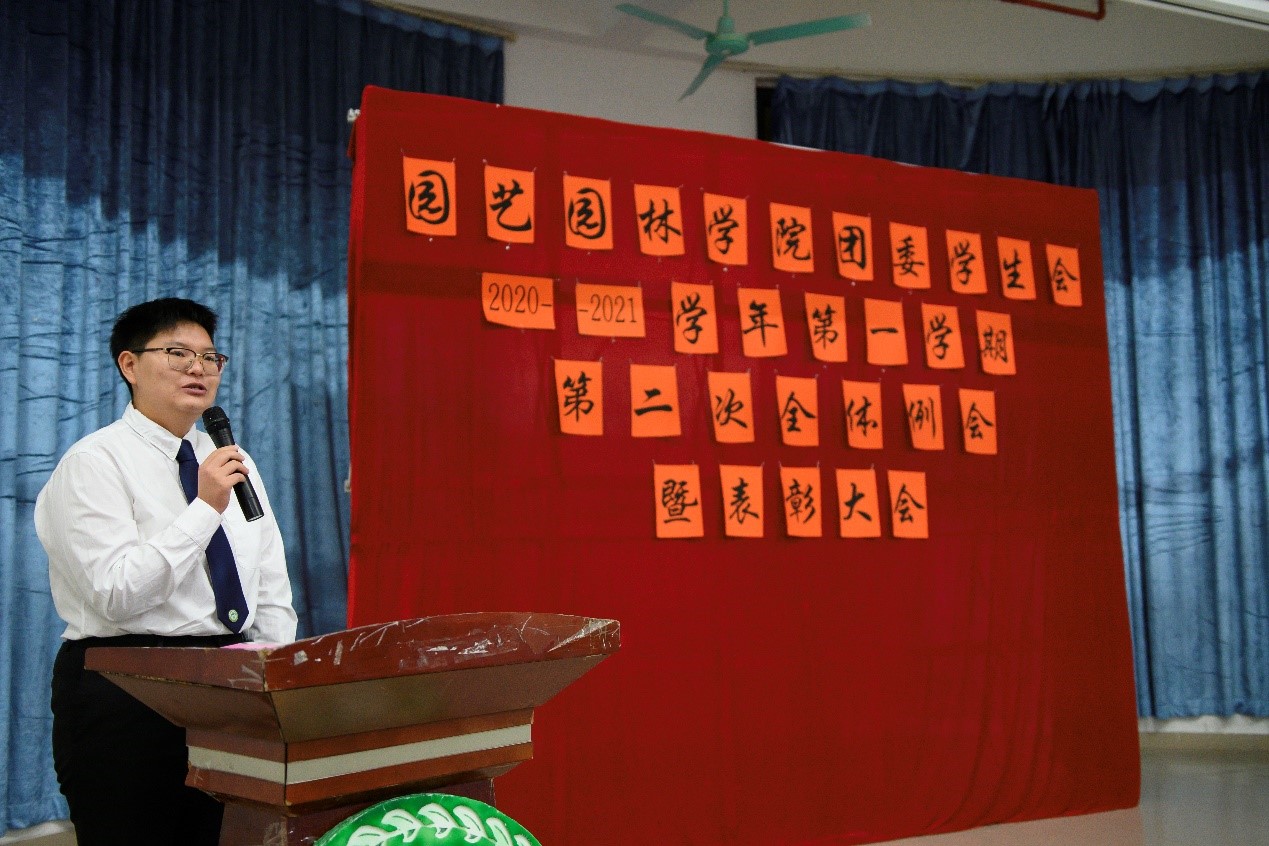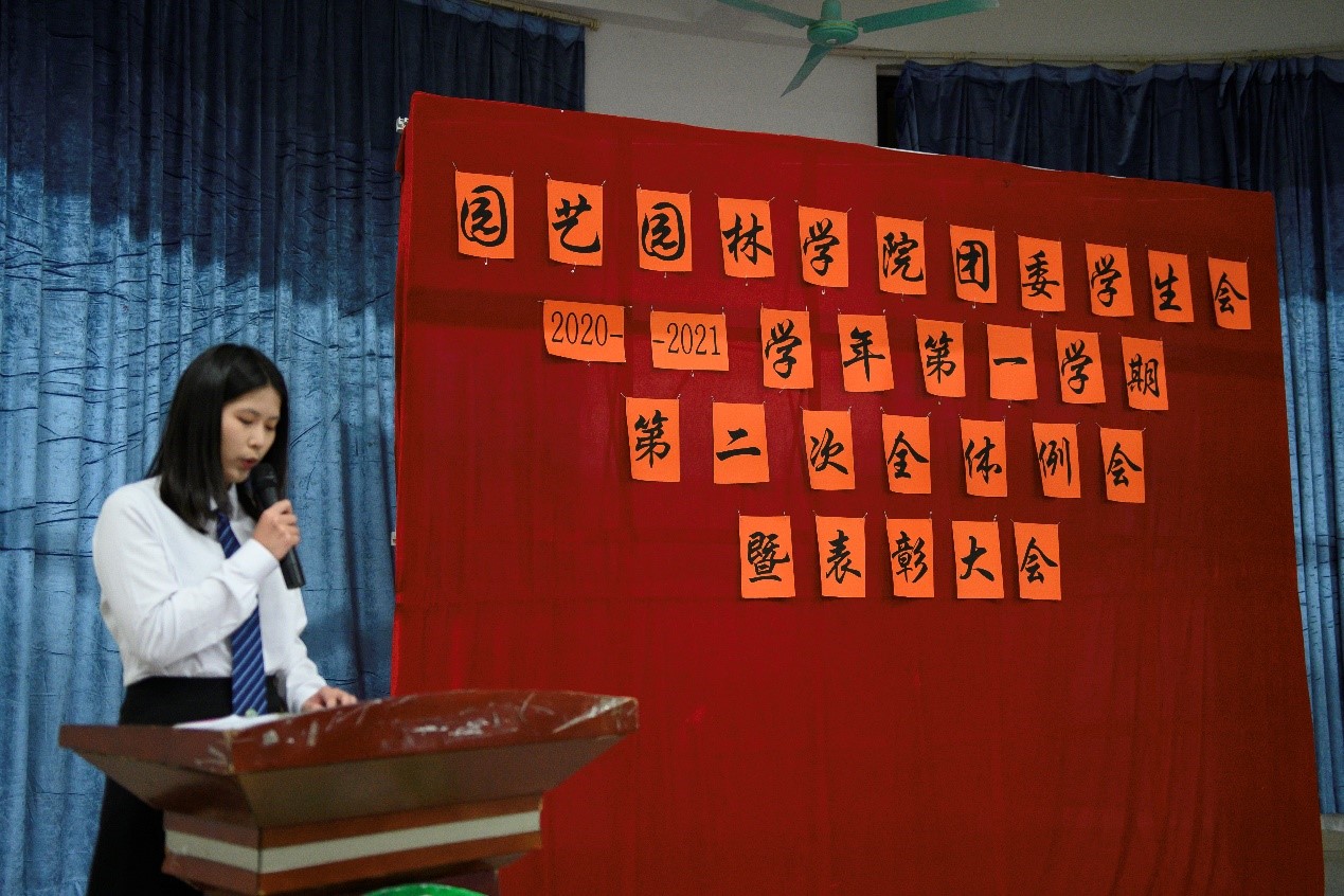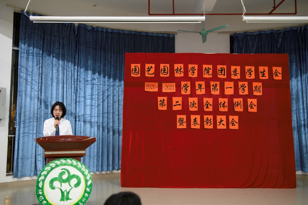 为表彰运动会获奖运动员、总结团委学生会一学期以来的工作情况,园艺园林学院于1月5日晚在白云校区D1小礼堂召开团委学生会2020年-2021学年第一学期第二次全体例会暨表彰大会。辅导员李剑峰、聂恺阳,团委第一副书记吴红霏,第二副书记罗泽彬、黄梓潆,学生会执行主席纪悦,青协执行会长周晓梦及校学生会代表和校团委代表出席本次会议,我院团委学生会全体干部以及校运会、院运会获奖同学参加本次会议。