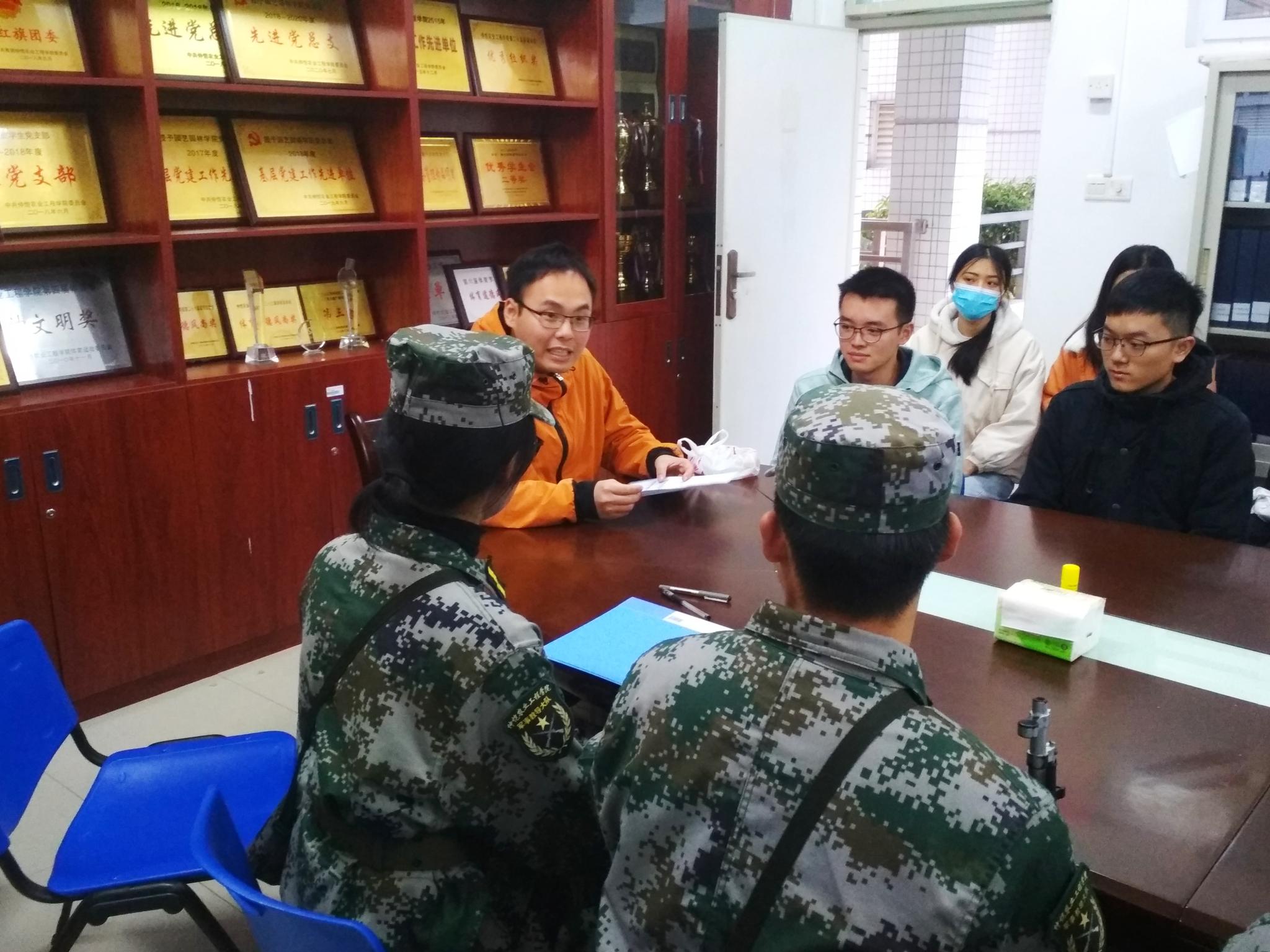 李剑峰老师向教官团询问军训要求,并表示学院会协助教官团完成20级学生军事训练工作,提高20级学生纪律意识;此外,他还了解了助班值班安排情况,确保助班值班制顺利落实。教官团提醒助班团在值班时间内要保证通讯畅通,以便及时处理可能出现的意外事故。