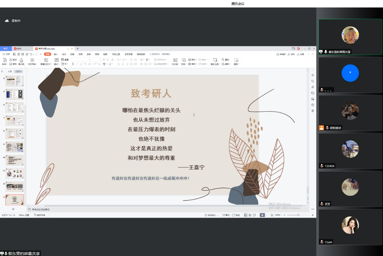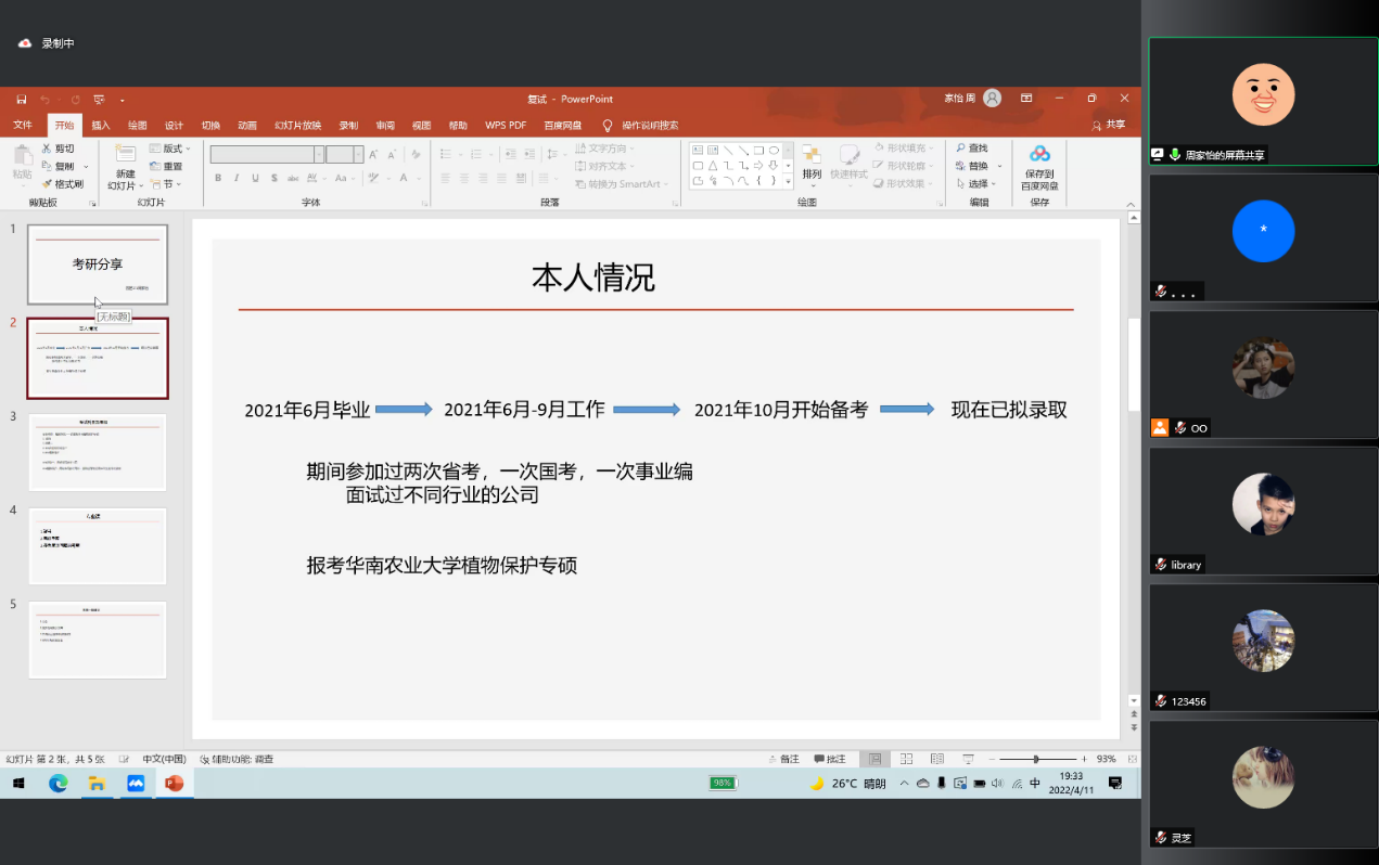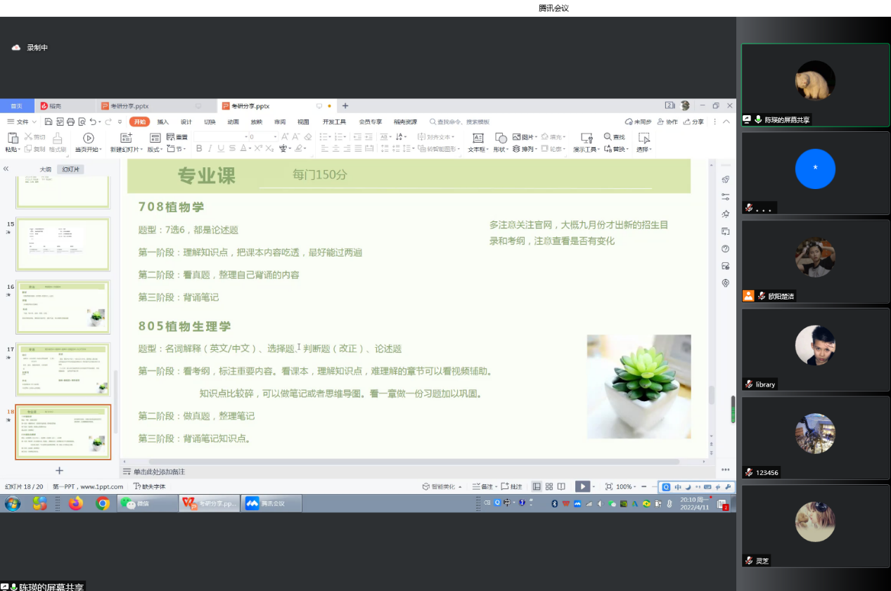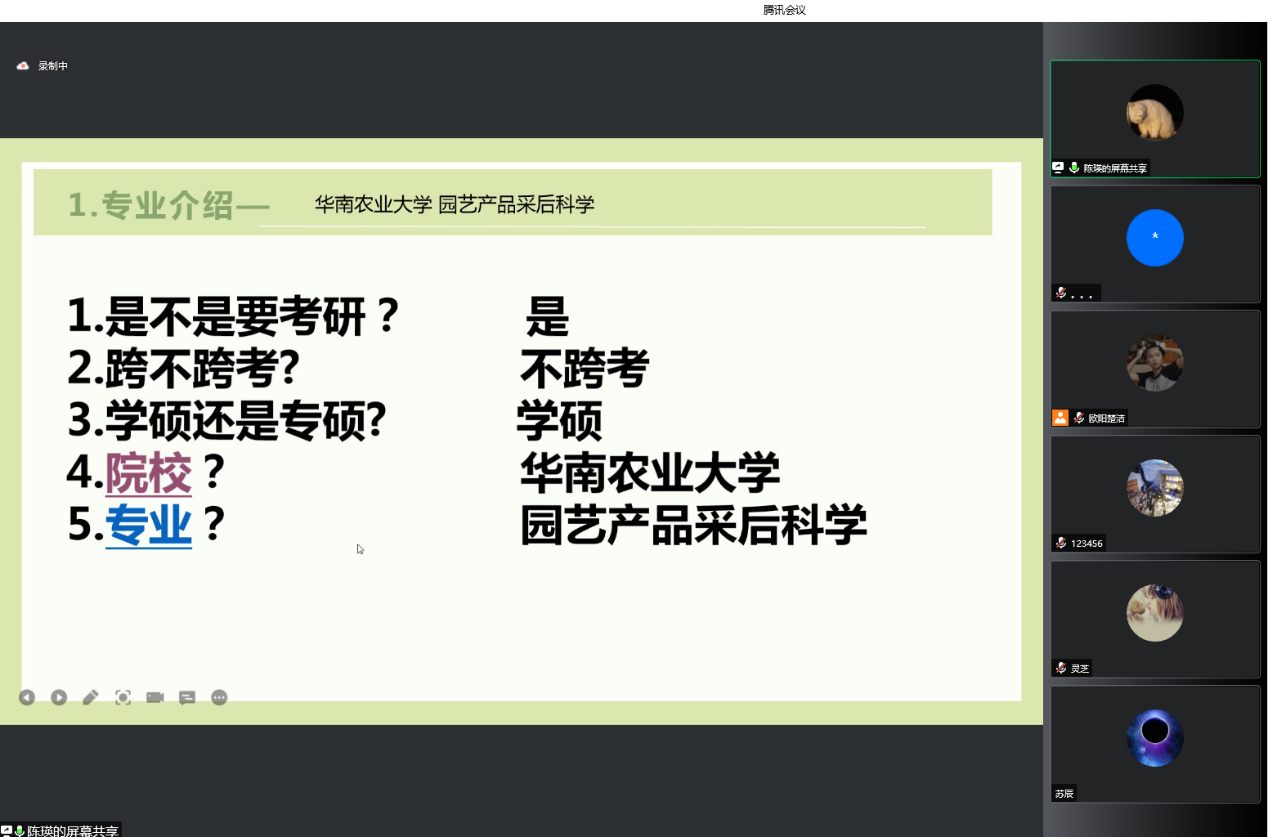 为了增加同学们对考研信息及情况的了解,提前做好规划。4月11日,园艺学生党支部在腾讯会议开展“我是党员我先行”的考研分享会活动,会议邀请考取华南农业大学研究生的周家怡同学、陈瑛同学、杨佳玲同学以及考取广州大学研究生的蔡东雯同学为园艺专业的同学们介绍了考研的相关信息及考研学习的经验,此次分享会由聂恺阳同志和欧阳楚洁同志主持。