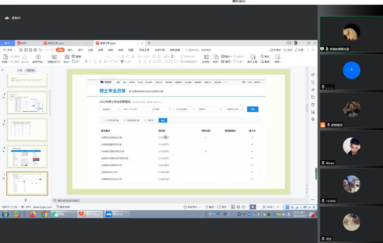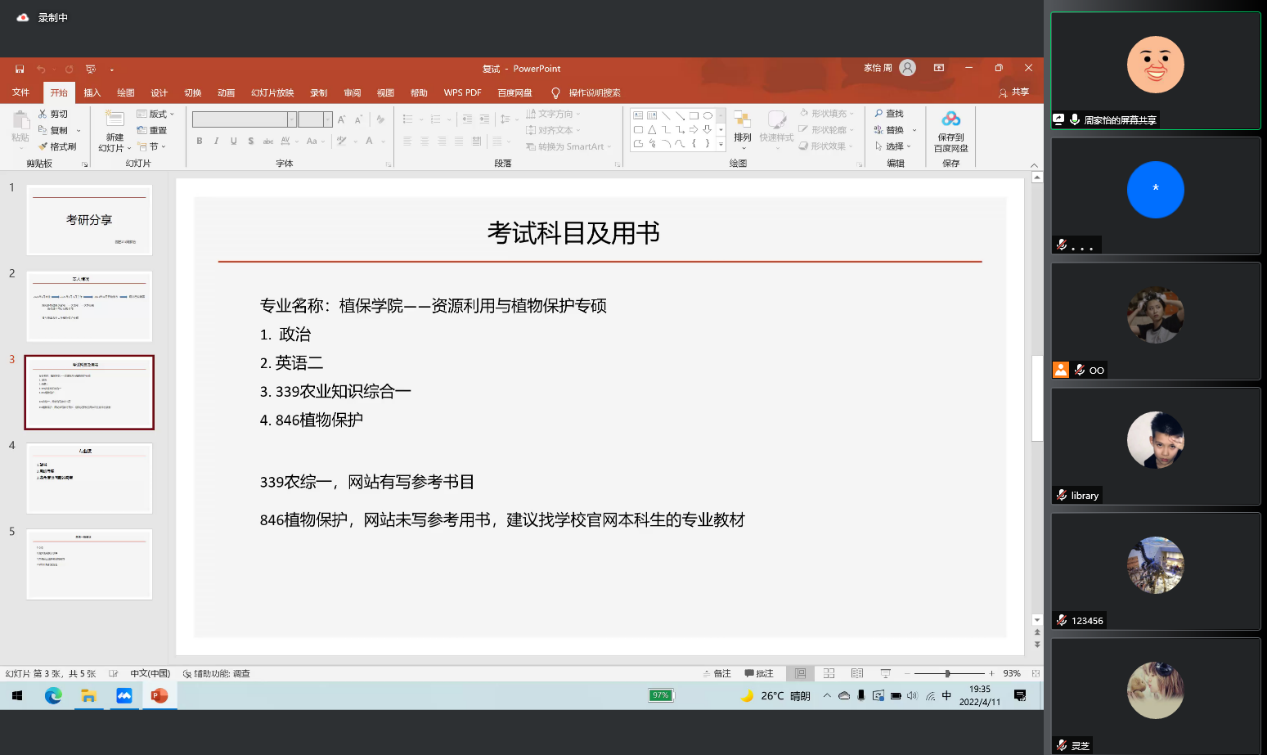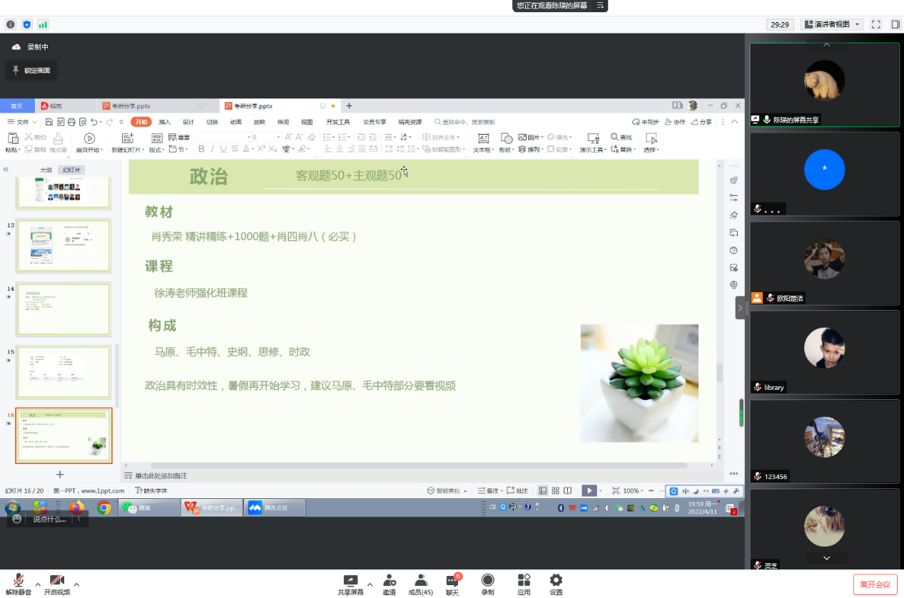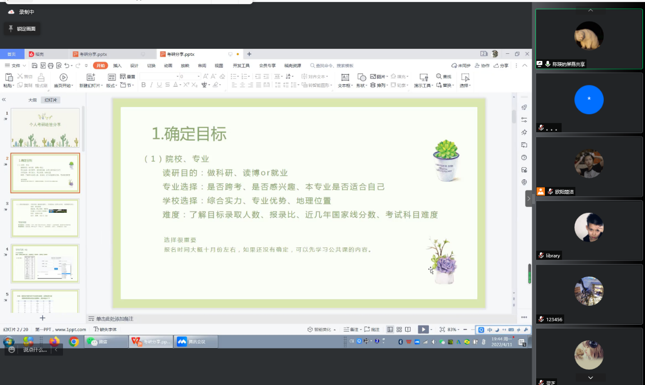 为了增加同学们对考研信息及情况的了解,提前做好规划。4月11日,园艺学生党支部在腾讯会议开展“我是党员我先行”的考研分享会活动,会议邀请考取华南农业大学研究生的周家怡同学、陈瑛同学、杨佳玲同学以及考取广州大学研究生的蔡东雯同学为园艺专业的同学们介绍了考研的相关信息及考研学习的经验,此次分享会由聂恺阳同志和欧阳楚洁同志主持。