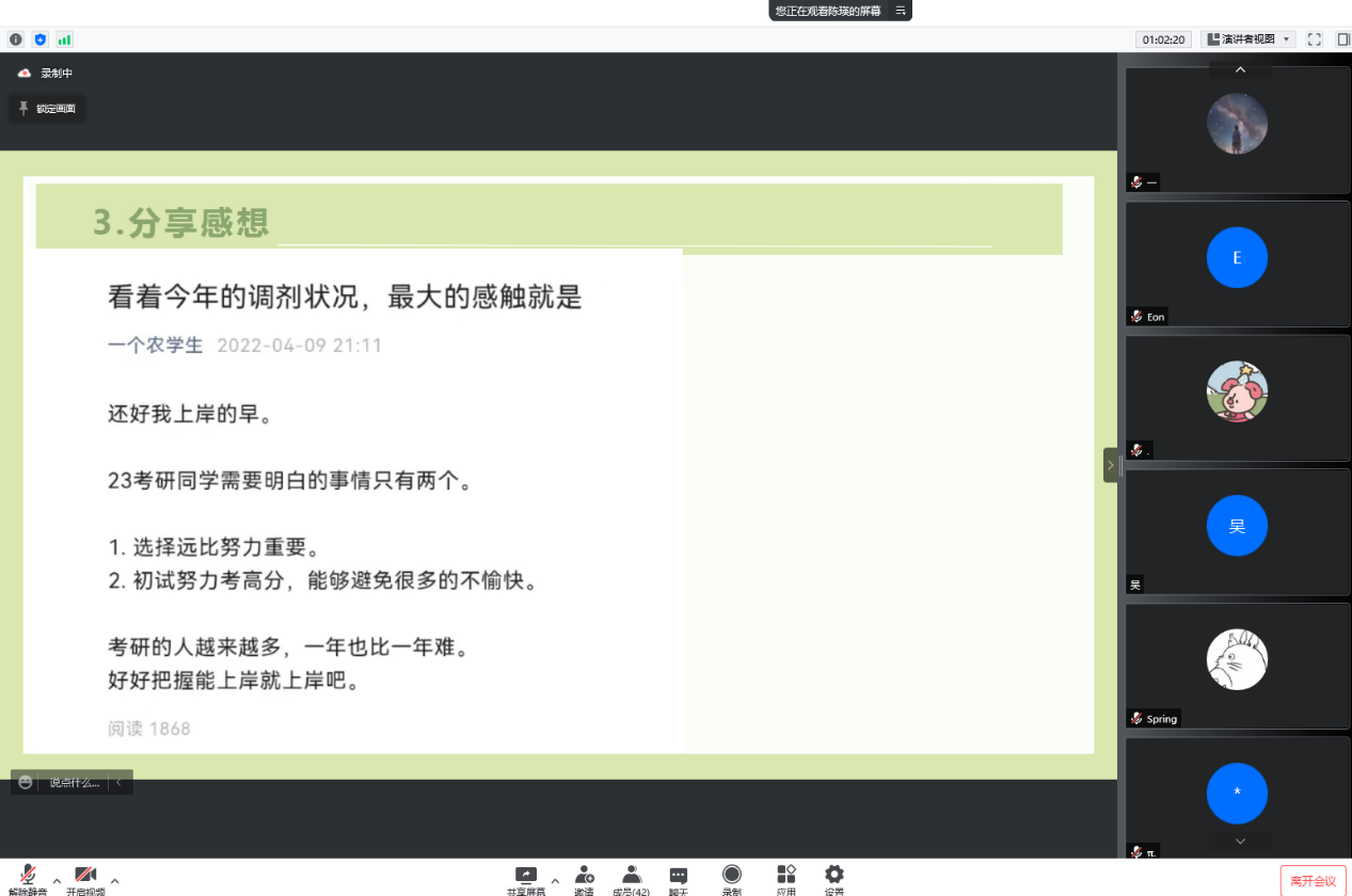 感谢园艺党支部同志们的分享,经过这次分享,相信同学们对考研有更加深入了解,知道如何选择考研专业,怎样做好各阶段时间规划,科学地安排时间进行全方位的复习,把心态放好。相信园艺专业的学生通过自己的努力奋斗能够在之后的时间里收获一份令自己满意的成绩!