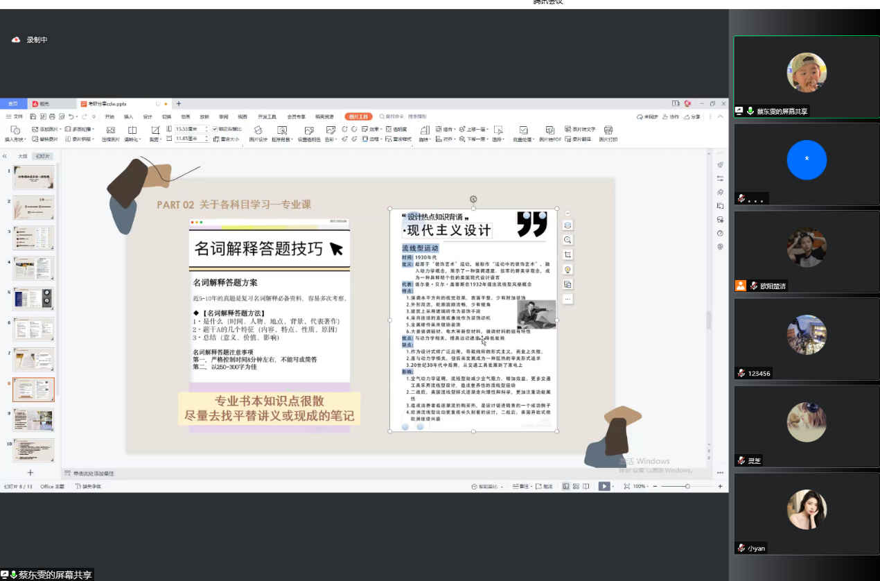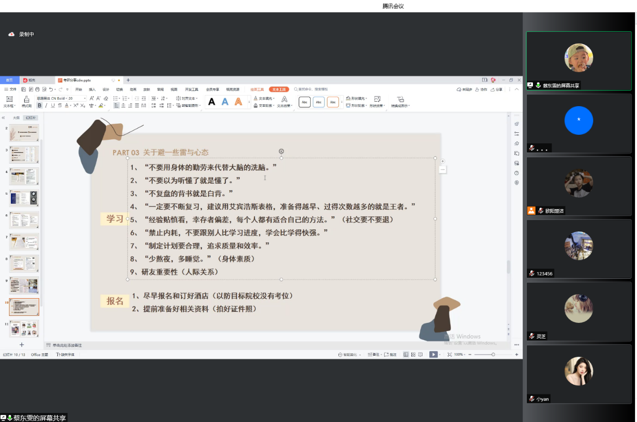 紧接着是蔡东雯同志针对跨专业考研的同学一些建议,她建议去找相关专业的一些师兄师姐,建议报考院校专业的初试跟复试是7:3比例的,上岸的可能性会高一些。接着她分享了各科目学习的经验,政治可以用记口诀的方式、看讲义来学习,专业课可以用套路解题,建议尽早看完知识点,并开始背和默写,11月起建议开始各科掐时间来进行模考,找到考试状态。也给到了我们一些避雷的建议:控制好社交软件的使用频率,经验贴看完要有自己的思考,考研的过程中不仅是收获知识,而且收获成长。尽早报名,拿到一个比较好的考位,提早订好酒店,坚持到最后。