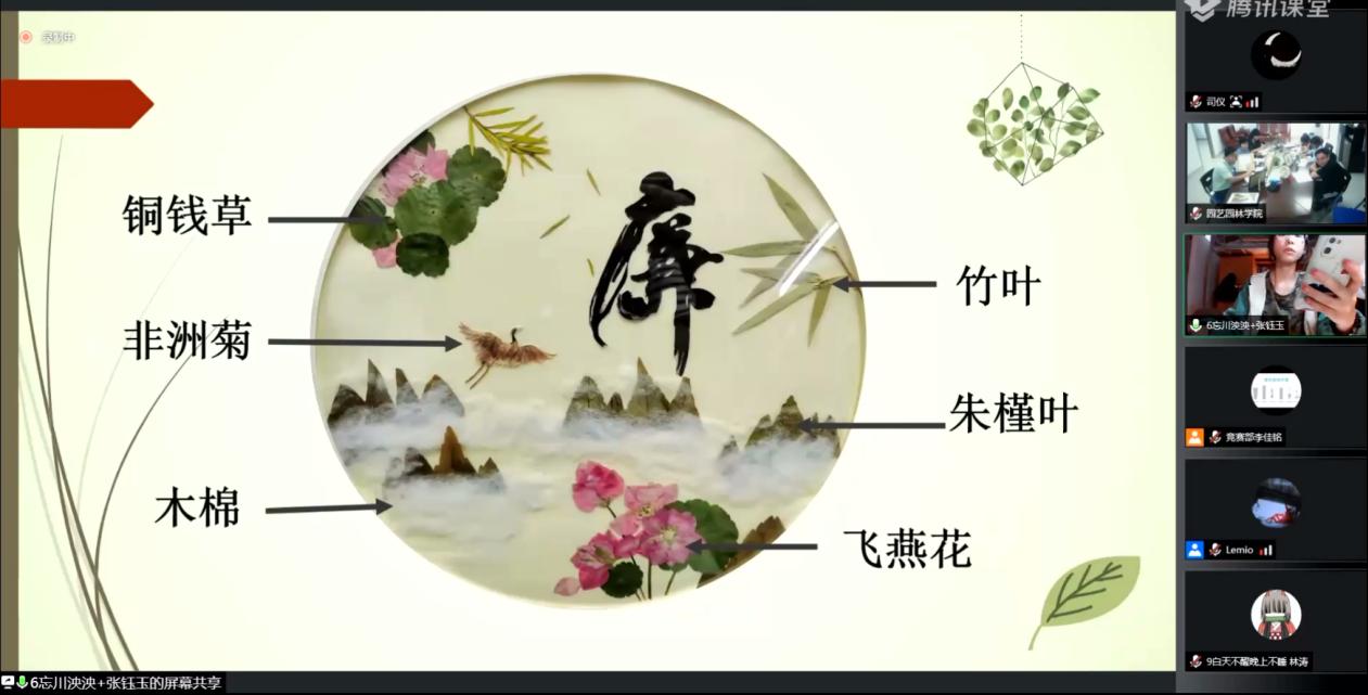 为迎接中国共产党第二十次全国代表大会的胜利召开,弘扬廉洁之正气,营造风清气正的校园环境,5月11日下午,由学校纪委、学校团委主办,园艺园林学院承办的仲恺农业工程学院第八届“艺林杯”压花大赛决赛以腾讯课堂形式隆重举行。学校纪委副书记刘兵、校团委书记熊友华、园艺园林学院党委书记陈晓玲、副书记石利刚出席,园艺园林学院惠俊爱、罗红辉和宋雯佩三位评委老师以及学院师生约1000余人参加直播、分享。