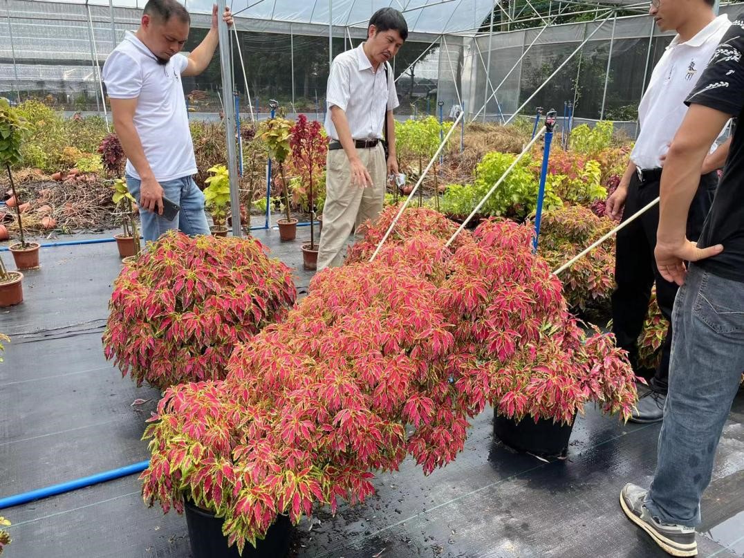 接下来到2022年6月24日,即彩叶草F1代种子苗定植大田生长一个半月后,周厚高教授、罗红辉副教授、伍青讲师三位老师再次带领本班研究生到广州厚德农业科技有限公司基地。经过一个多月的培育,彩叶草F1代单株生长情况良好,可以进行大田优良单株观察和评估。观测各单株的差别,包括整株形态、叶片颜色、色块分布模式、叶型和长势、叶片大小等差别。初步选择优秀单株并编号作标签。