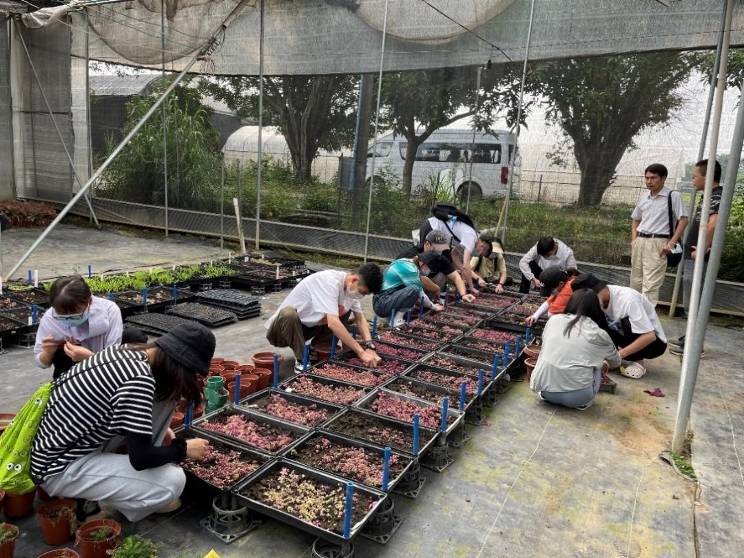 2022年5月6日,园艺园林学院周厚高教授、罗红辉副教授、伍青讲师带领10位21级学硕班研究生深入基层,到白云区寮采村广州厚德农业科技有限公司基地参观学习彩叶草品种选育过程。