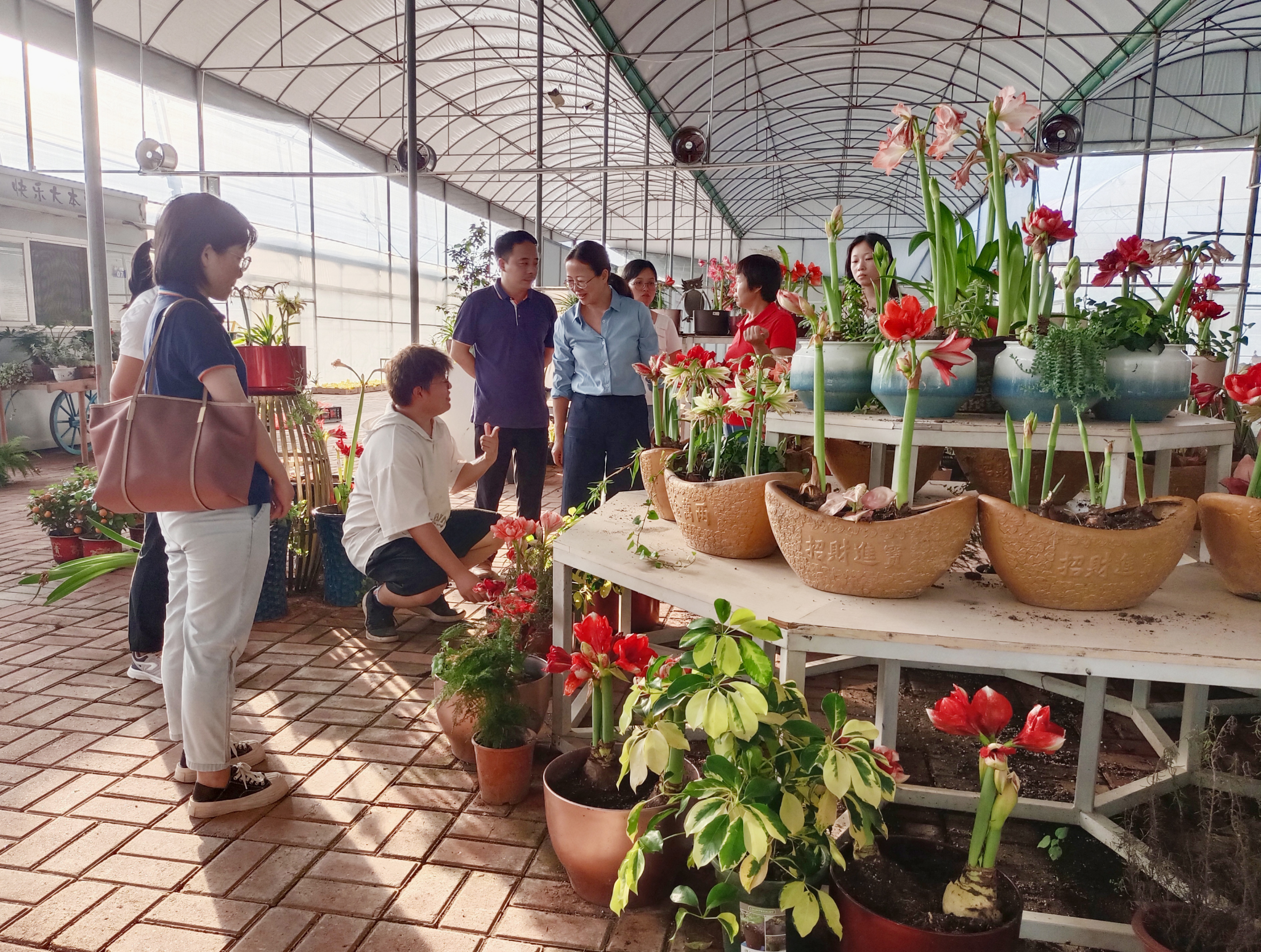 在曹雪莹和公司数名仲恺校友的陪同下,调研组一行参观了朱顶红种质资源库、朱顶红种植基地大棚。不同花色、花型的朱顶红琳琅满目,竞相绽放。据了解,圣茵公司通过长期的技术研发,掌握了朱顶红的花期调控技术,大大提高了朱顶红的商品性,实现了一年四季均有花可赏。