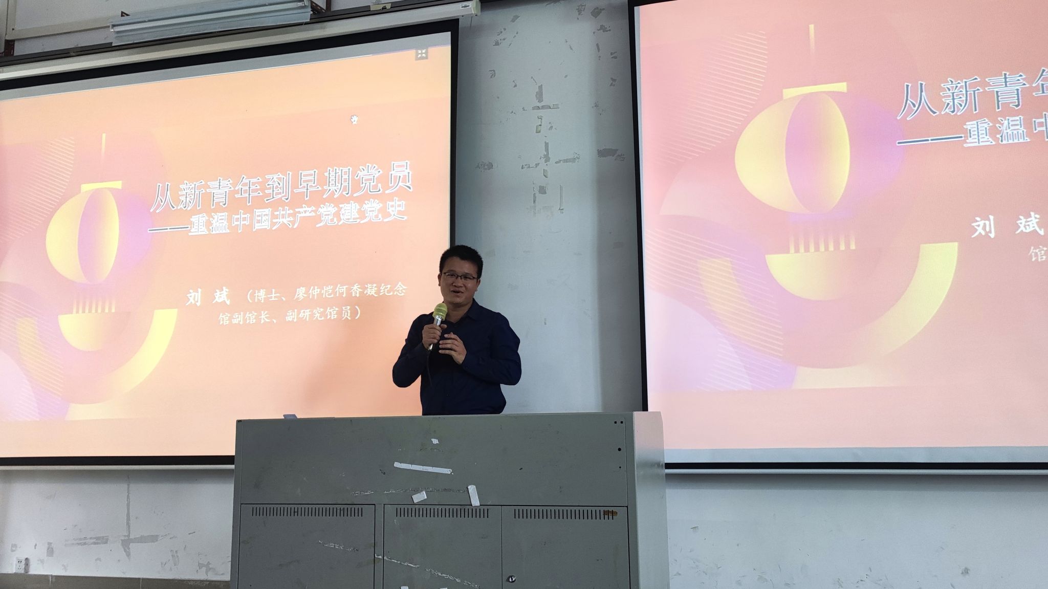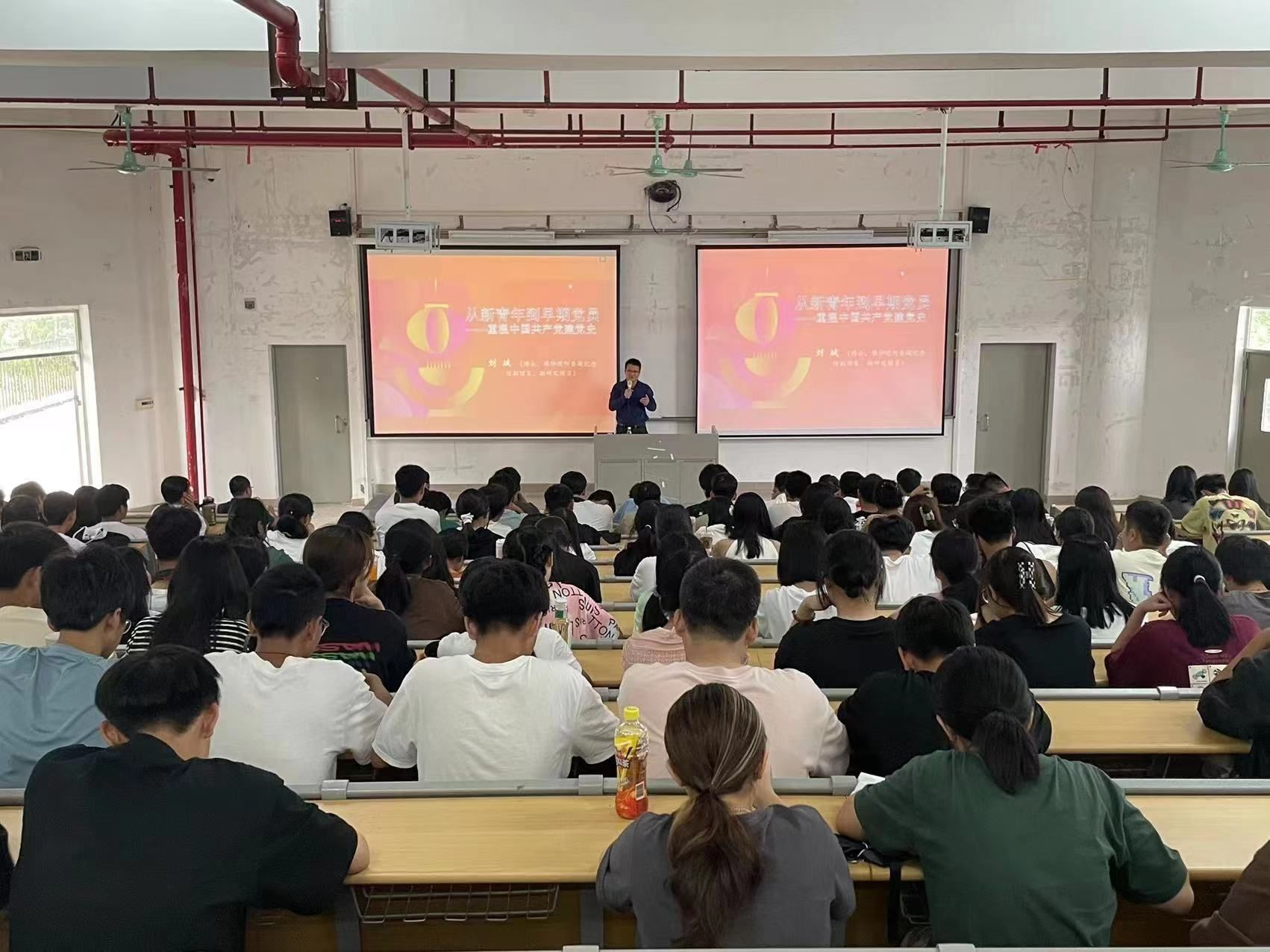 首先,刘斌用红船精神、建党精神引出中国共产党建党史,通过大量史料、重要事件讲述中国共产党建党原因、建党经过,与其他政党相比较的特质。早期党组织成员40%为在校大学生,怀抱共同信仰,立志参加党组织,实现救国救民、建立理想社会的初衷,具备先进性、有理想、组织力、行动力的重要特点。中国共产党是理想型政党,根植于中国传统儒家文化,以天下为公,以实现广大人民对美好生活追求和共同富裕为目标,具备其他政党无法比拟的优势。最后,刘斌勉励同学们树立理想信念,肩负历史赋予的使命,要跟先进的人在一起、跟有追求的人在一起、跟道德水准高的人在一起,立志成长为一名合格的共产党员。