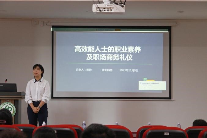 为加强同学们对职业生涯规划的认识,了解职场礼仪,提高同学们综合职业素养,11月9日下午,园艺园林学院在生命科学大楼B座604学术报告厅举办第十三期“弘毅自强”礼仪专题培训会。本次培训会特邀广州普邦园林股份有限公司集团总部人力资源中心副总监熊静为主讲嘉宾。园艺园林学院党委副书记王红山、辅导员黄慧娟到场聆听,学院近百名学生参与本次培训会。