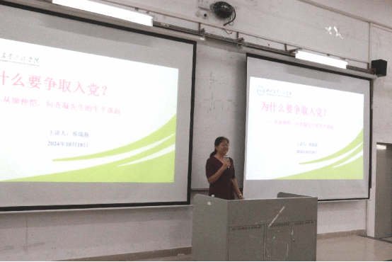 蔡瑞燕作题为《为什么要争取入党?--从廖仲恺、何香凝的生平谈起》的报告,通过讲述廖仲恺、何香凝先生与共产党相关的一些生平事迹,让同学们有了更加丰富的认识。蔡瑞燕强调,廖仲恺和何香凝夫妇是中国近代史上著名的革命家和政治活动家,他们的一生都在为中国的革命事业奋斗不息,两位先生的事迹充分体现了中国共产党人的崇高理想和无私奉献精神,鼓励同学们都要以廖仲恺、何香凝先生为榜样,将个人的理想追求融入国家和民族的发展之中,努力成为有理想、有担当、有作为的新时代青年;希望同学们珍惜大学时光,把握每一个学习机会,不断提升自己的综合素质,自觉成长为新进代新征程的建设者和奋斗者。