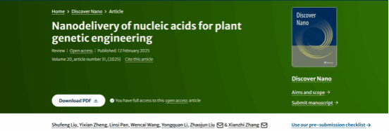 近日,园艺园林学院21级园艺专业本科生刘树峰以第一作者身份在国际知名期刊《Discover Nano》发表了题为“Nanodelivery of nucleic acids for plant genetic engineering”综述性论文,仲恺农业工程学院为第一署名单位,论文指导老师为园艺系专任教师张宪智副教授,张宪智副教授和新疆农科院园艺所刘昭军研究员为共同通讯作者。Discover Nano是Springer Nature出版社旗下Discover系列期刊之一,期刊原名称Nanoscale Research Letters,IF2023=5.5,JCR Q1区。