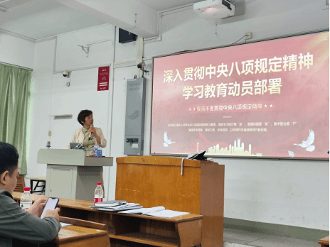 陈晓玲传达学校党委深入贯彻中央八项规定精神学习教育部署会议精神,带领大家学习中央八项规定精神的主要内容,从深思“为何学”、勤思“学什么”、常思“如何学”等三方面阐述学习教育的重要意义和具体要求,并就有序开展学习教育进行动员部署,期望老师们特别是党员干部:一是要落实立德树人根本任务,践行“为党育人、为国育才”的使命,必须要弘扬党的优良作风,以扎实的作风建设推动学院高质量发展,努力实现培根铸魂育新人的工作目标;二是以学习教育为契机,切实提高思想认识,把改进工作作风的重点放在提升工作效能,端正工作态度上,立足教育教学岗位,争做新时代好老师。