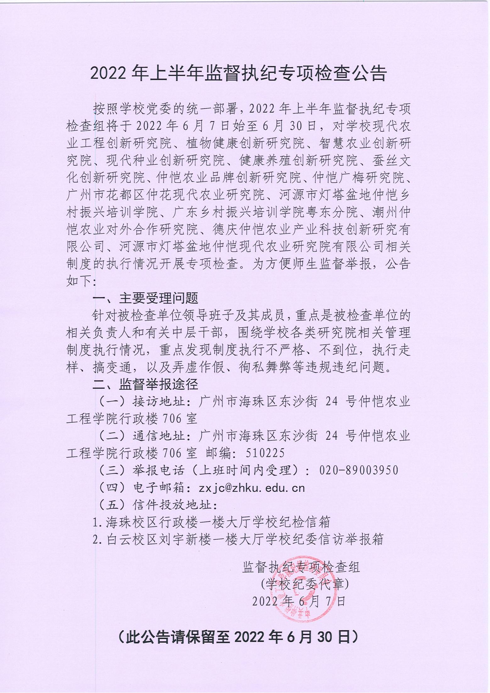 2022年上半年监督执纪专项检查公告
