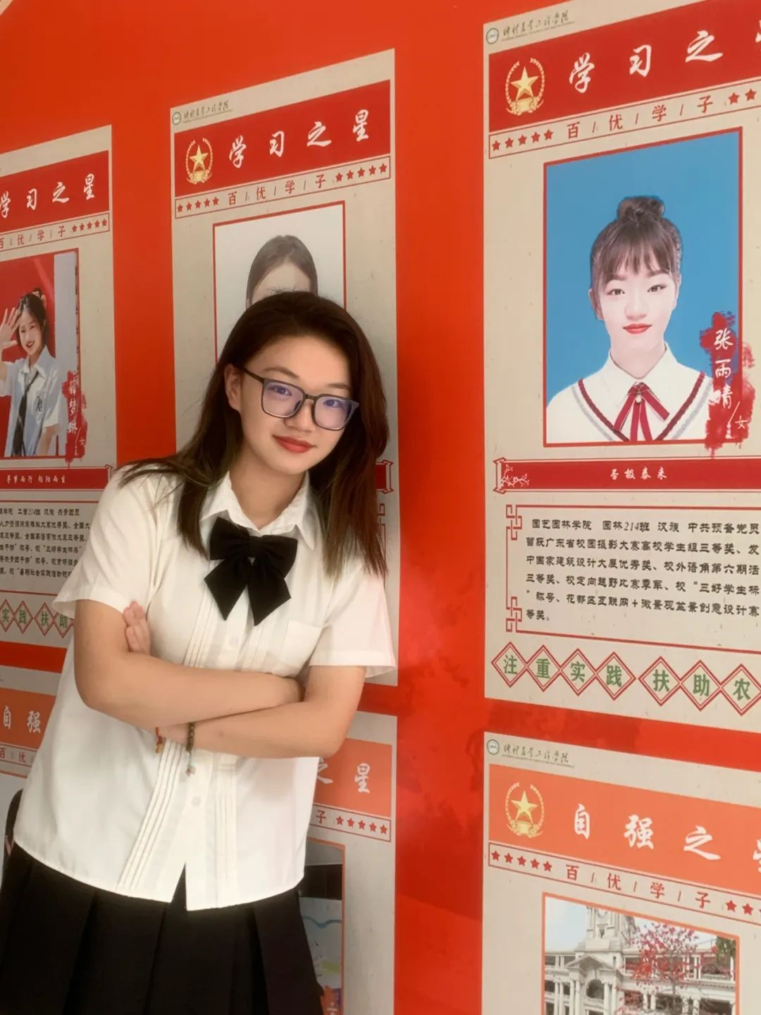 张雨晴,女,汉族,中共预备党员,就读于园艺园林学院园林214班,曾任院办公室干事、院就业委副主任、院辩论队队长、学生党支部党务助理等6种职位。