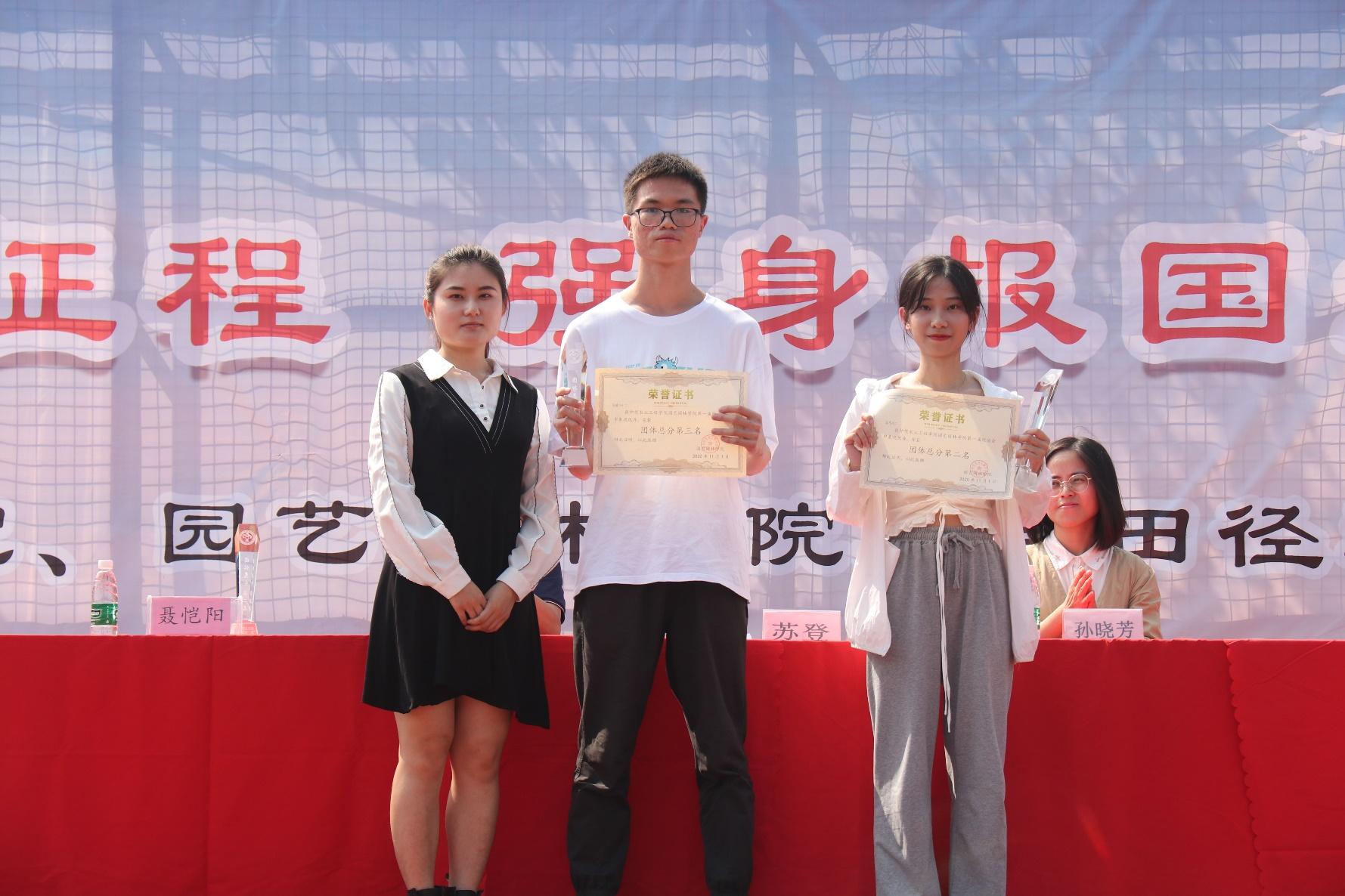 本次运动会项目众多,设有男女100m、200m、4×100m、4×400m、男女三级跳、跳远等项目。在比赛现场,场上运动员敢于拼搏,勇夺佳绩;场下观众呼声不断,喝彩连连。1号下午,所有比赛项目正式结束,院领导为此次运动会获奖班级及个人颁奖。其中,我院获得团体总分前三名的班级分别为:园林202班、园艺201班、园林204班。园林206班获道德风尚奖。