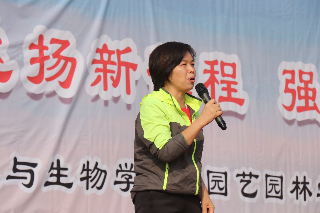 农业与生物学院党总支书记陈丹雄为本次运动会致开幕词。陈丹雄指出,本次运动会以 “青春飞扬新征程,强身报国新时代”为主题,以“团结,进取,友谊,协作”为宗旨,希望同学们赛出水平,赛出风格,为班争光,为校争彩。升旗仪式结束后,园艺园林学院党总支书记陈晓玲宣布本次运动会正式开始。
