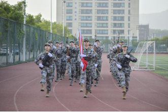 清晨的第一缕阳光透过薄雾洒满五星红旗,国旗护卫队迈着铿锵有力的步伐护送国旗入场。在雄壮的国歌声中,五星红旗冉冉升起,全体师生庄严肃立,高唱国歌,行注目礼,表达对祖国的深切热爱与崇高敬意。