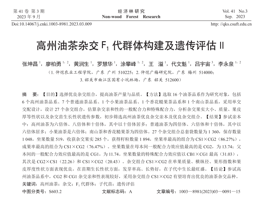 近日,我院教师廖柏勇,涂攀峰,王溢,代文魁,李永泉教师团队在《经济林研究》刊物联合发表文章——“高州油茶杂交F1代群体构建及遗传评估Ⅱ”,文章以 16 个油茶品系作为研究对象,通过单交交配设计,设计 27 个杂交组合,估算杂交亲和性的一般配合力和特殊配合力,分析杂交果实大小、质量、果皮厚等性状以及杂交苗生长性状遗传参数,初步筛选高州油茶优良杂交亲本及优良杂交组合,为油茶产量与品质提升做出重要贡献。