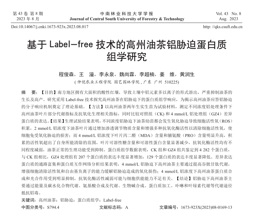 近日,我院的李永泉,王溢教师团队以高州油茶两年生实生苗为实验材料,在《中南林业科技大学学报》刊物联合发表了题为“基于Label-free技术的高州油茶铝胁迫蛋白质组学研究”文章,测定不同浓度铝处理条件下高州油茶叶片部分代谢指标及抗氧化生理相关指标,同时比较对照组(CK)和4 mmol/L铝处理组(GZ4)差异蛋白质的表达,为揭示高州油茶应答铝胁迫的分子响应机制奠定了理论基础。