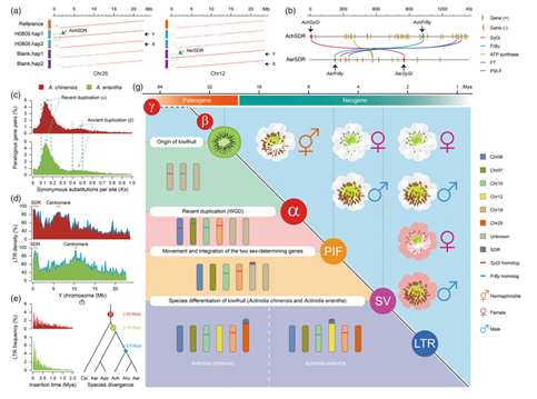 岳教授团队运用新组装策略,分别获得了中华猕猴桃和毛花猕猴桃(A. eriantha)雌、雄株的高质量基因组,基于两个物种X染色体和Y染色体的单倍型序列比较分析,鉴定出Y染色体上的性别决定区域(SDR),发现中华猕猴桃的Y-SDR区域位于25号染色体,而毛花猕猴桃的Y-SDR区域在12号染色体。结合新近报道的软枣猕猴桃(A. arguta)、葛枣猕猴桃(A. polygama)、山梨猕猴桃(A. rufa)的Y-SDR区域研究结果,岳教授团队构建了猕猴桃属物种性染色体的演化历程,指出全基因组加倍、染色体异位、重复序列的积累是导致猕猴桃属不同物种之间性染色体和性别决定区域分化的潜在机制。