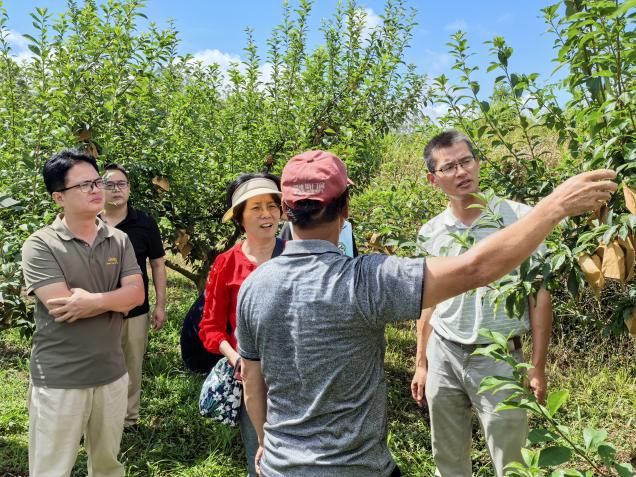 在更古村三华李和建棠村黄金奈李果园,针对农户种植习惯,强调清园、精准施用农药、李果横裂较多、落果严重补施微量元素、果后肥等技术注意事项,现场对比果园生草示范效应,同时讨论并强调了更新农户的观念及应对极端天气的重要性、及时销售青果、建立冷库等。