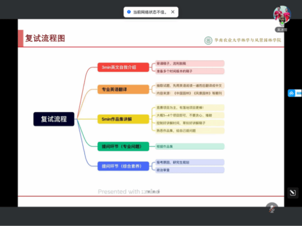 为帮助考研学子更好地备战复试,提升备考信心和技巧,3 月 4日,园艺园林学院举办 “助力研途,决胜复试” 考研复试经验分享交流会,交流会由辅导员黄慧娟主持。活动特别邀请了林涛、杨坤清、吴冰哲、伍泳媚四位在考研复试中表现优异的师兄师姐,为即将参加复试的同学提供宝贵的经验。