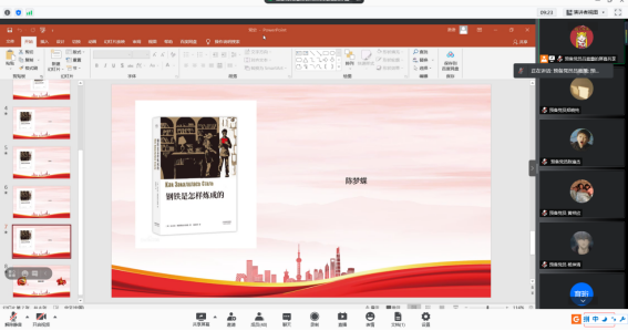此次的红色经典读后感分享会,园林学生党支部的学生党员们认真学习了有关《钢铁是怎样炼成的》的内容,了解了书本中保尔的人物性格以及顽强不息的精神,并明确认识到作为新时代青年,应具有像保尔这个主人公的钢铁般的意志,在生活和学习中不畏困难,勇往直前。