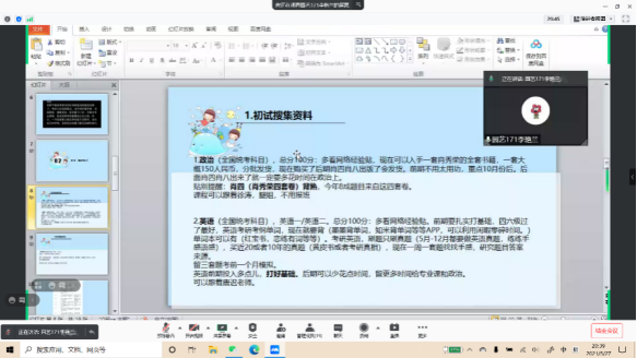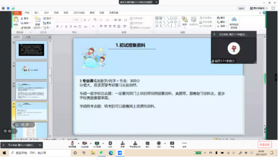 会议进入尾声,艳兰师姐鼓励大家坚持考研到最后一刻,锻炼好身体,保持好心态,寻找更多的研友一起学习,一起顶住压力!她也祝愿大家2022考研顺利上岸!大家经历了今晚的分享会后收获良多,同时也纷纷对师姐的演讲和鼓励表示感谢!